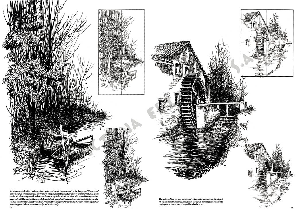 La sección dedicada al color se compone de numerosos paisajes realizados con diferentes técnicas; la del blanco y negro está dedicada al paisaje realizado con tinta china y pluma.