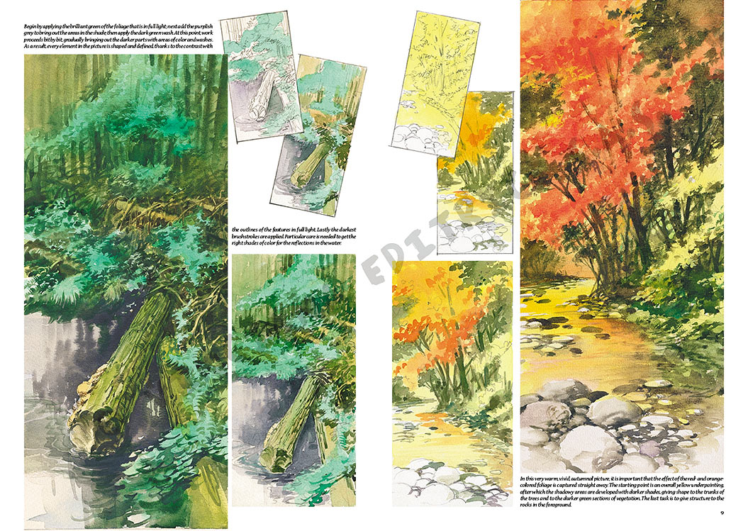 Un volume interamente dedicato al paesaggio dipinto in acquerello, le pagine dedicate alla tecnica del bianco e nero presentano una serie di bozzetti eseguiti a mezzatinta acquerellata (lavis).